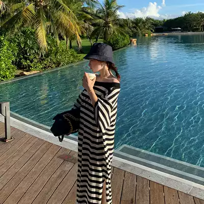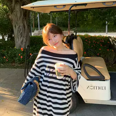 New fat sister gentle wind strapless 90-200 kg medium-length skirt one-shoulder loose striped dress female summer