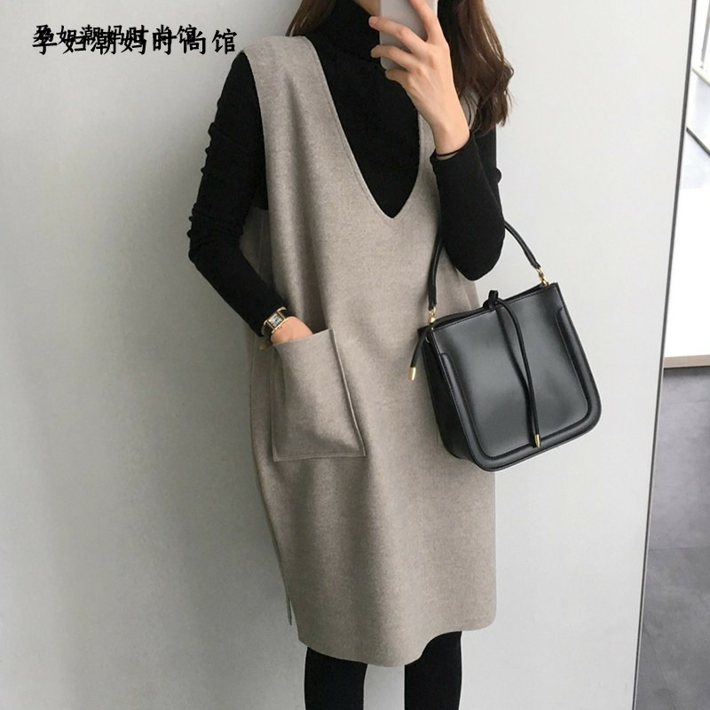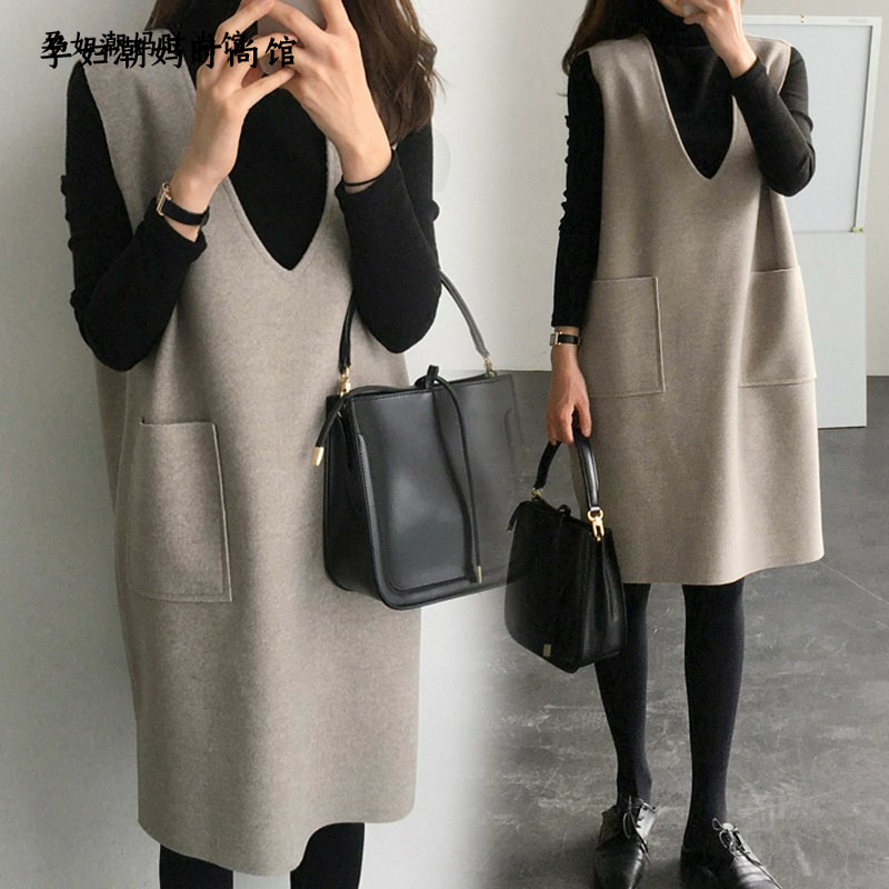 Maternity autumn suits new trendy mothers go out mid-length version of cotton V-neck fashion wide ocean two-piece dress