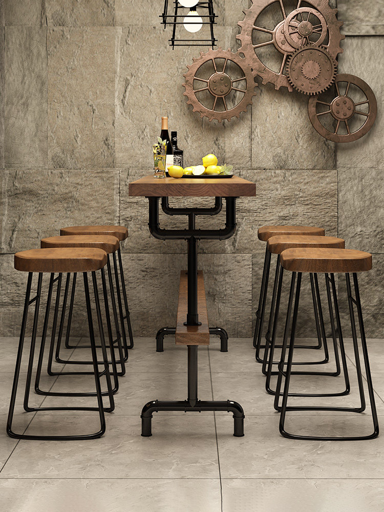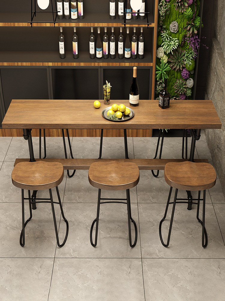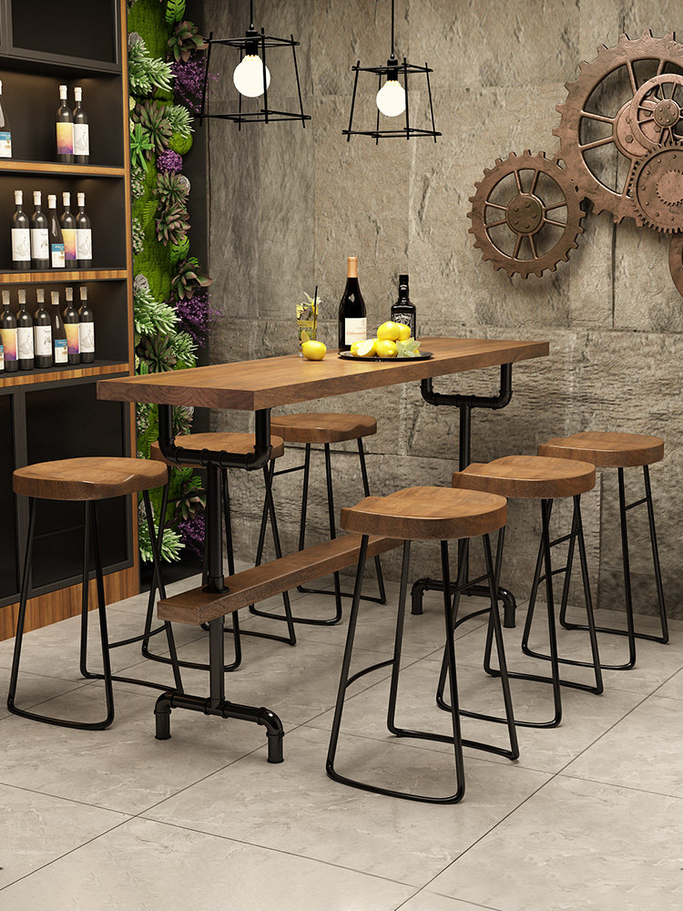 Retro Solid Wood Bar Table Chairs Iron Art Water Pipes Industrial Wind Leaning Against Wall Long Table Commercial Milk Tea Shop Tea Restaurant High Foot Table