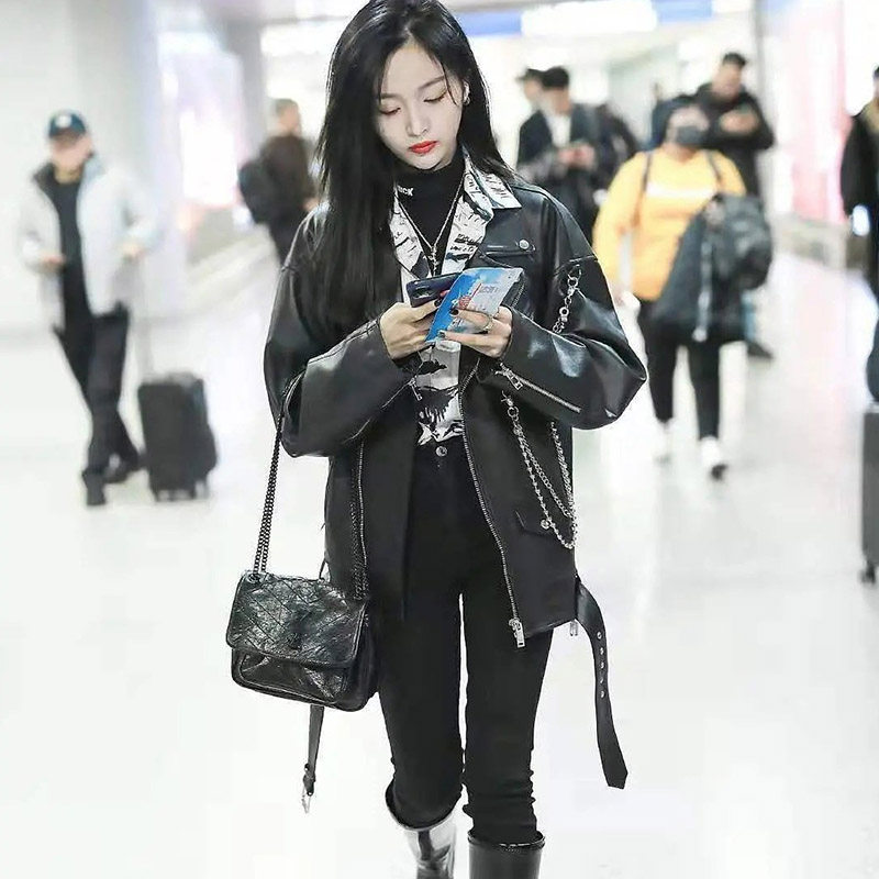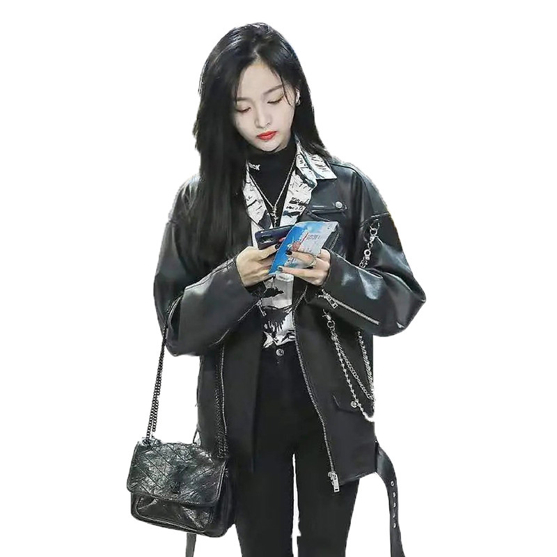 2022 Autumn New Rocket Girl Wu Xuanyi Star Same Leather Sheep Leather Women Loose Biker Jacket Jacket