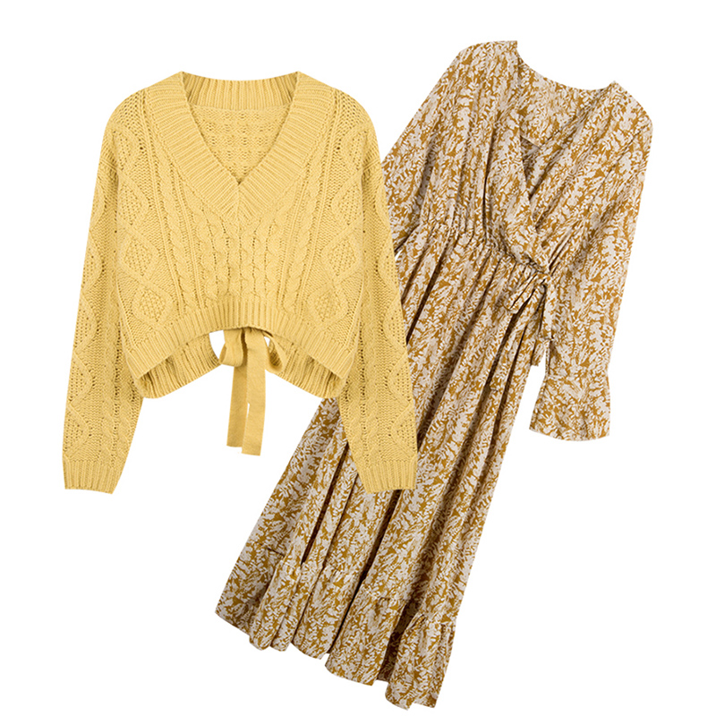 2022 spring and autumn new French retro floral dress lazy wind knitted strap sweater skirt two-piece suit