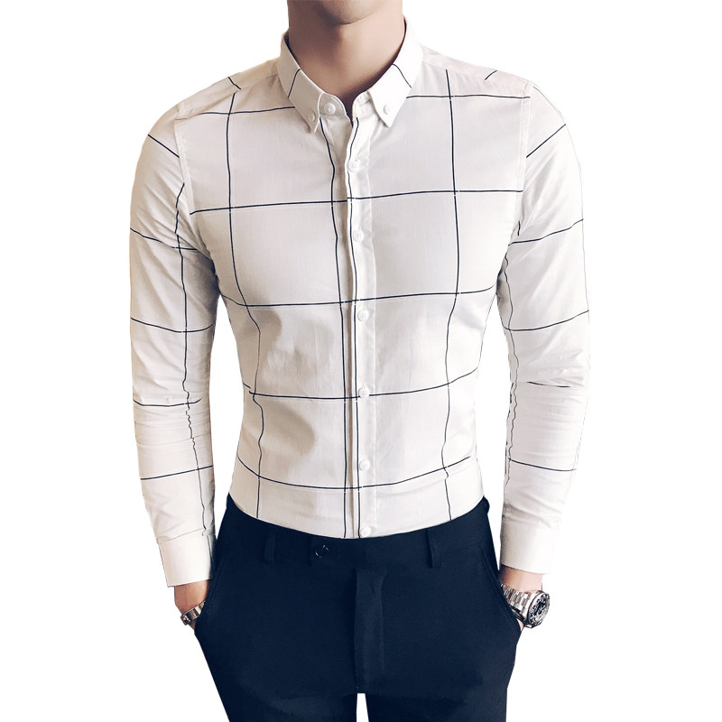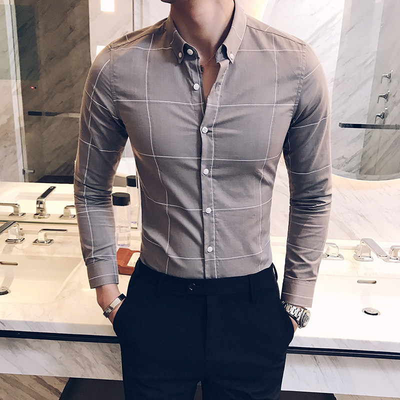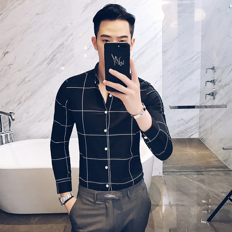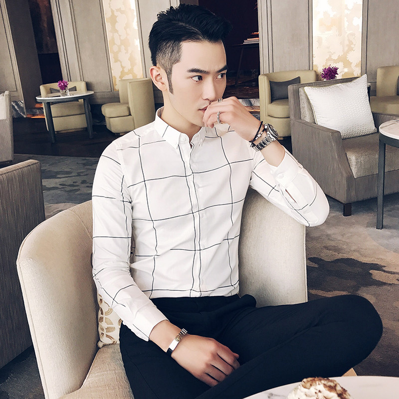 Plaid shirt male long sleeve fit Korean version fashion hairstylist men's white lining casual trend Inn wind men's clothing