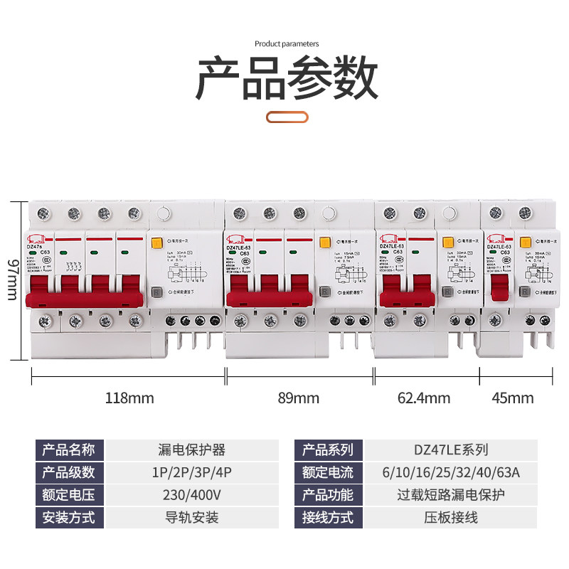 DZ47LE-63 leakage protector 1P N 2P 3P N 4P household air switch with leakage protection 63A