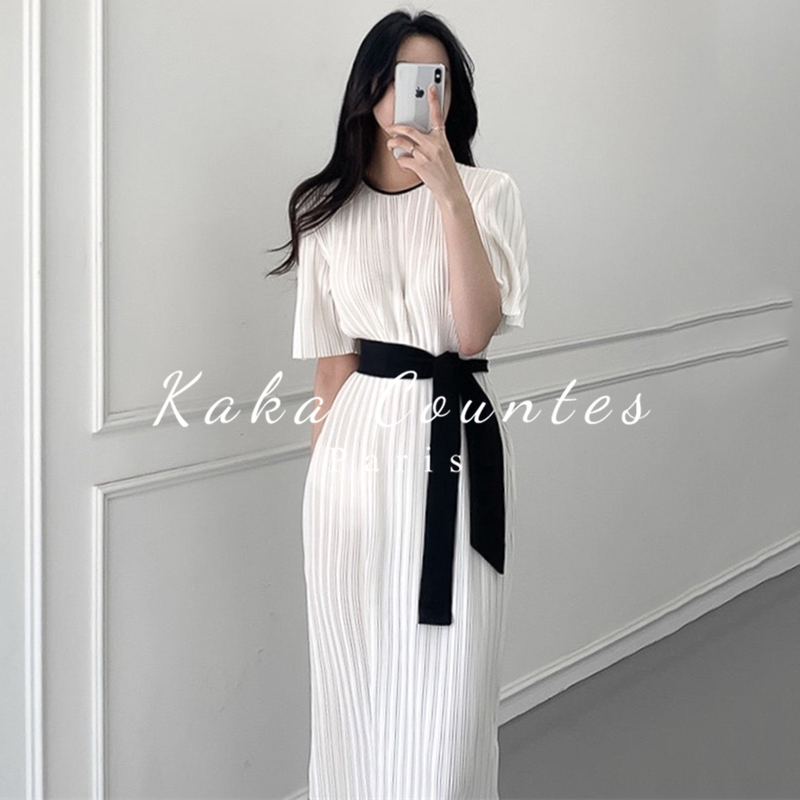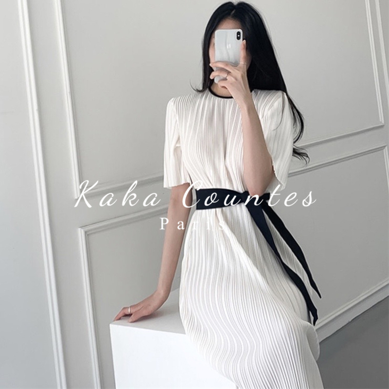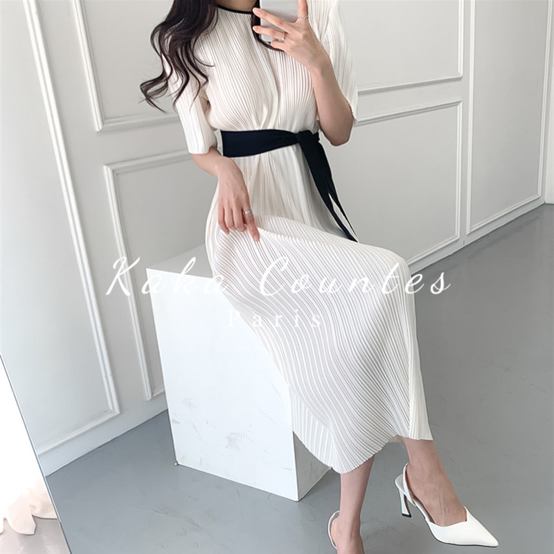 Sandro Mocoloni Temperament Round Collar Pressure Pleats Design Loose Lace to receive long version of Knee Dress Woman