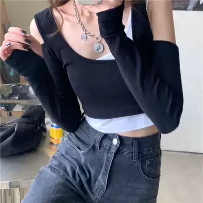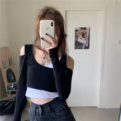 PPHOME today C position~Korean sexy and cool girl super beautiful contrast blue fake two-piece off-the-shoulder long-sleeved T-shirt female