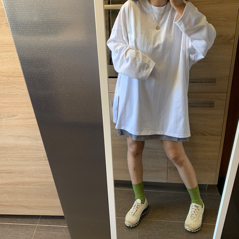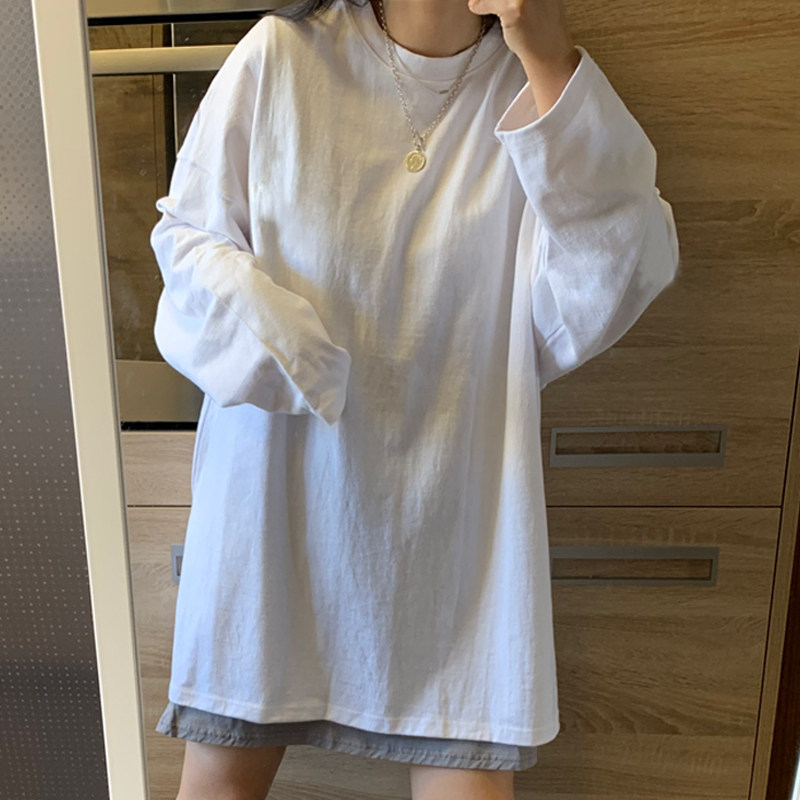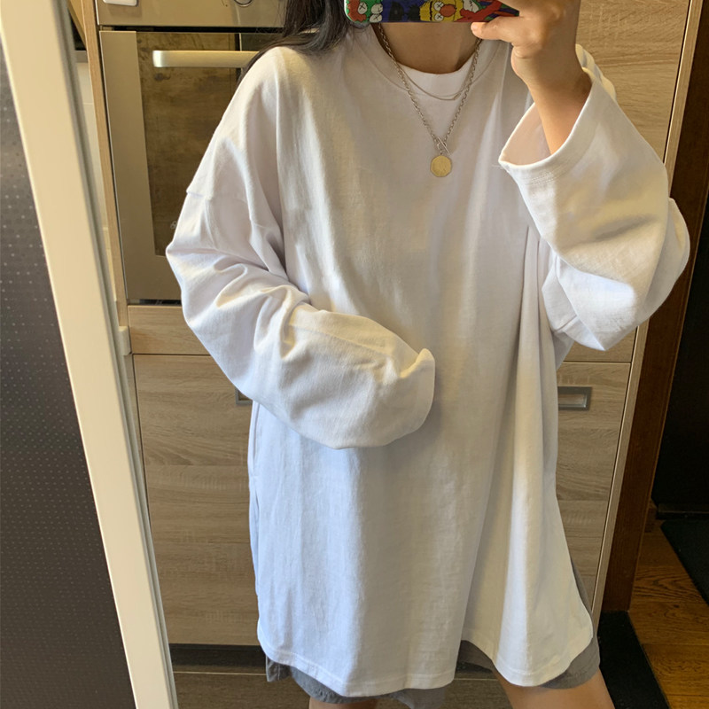Korean version of loose white long-sleeved fork T-shirt women autumn and winter 2020 new ins medium-length version of cotton size bottom shirt