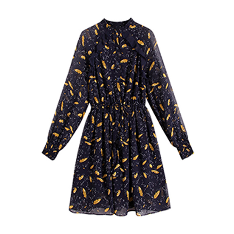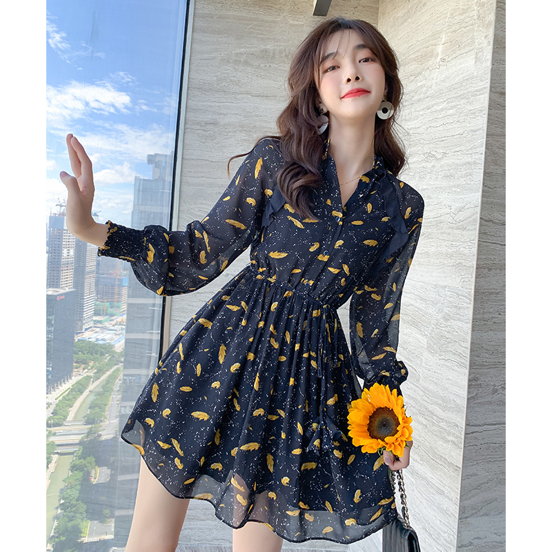 French vintage blue chiffon floral dress autumn 2021 new V-neck skirt niche design temperament