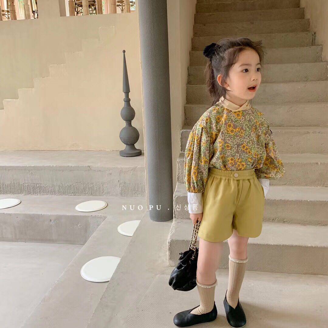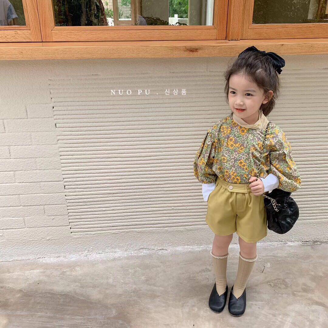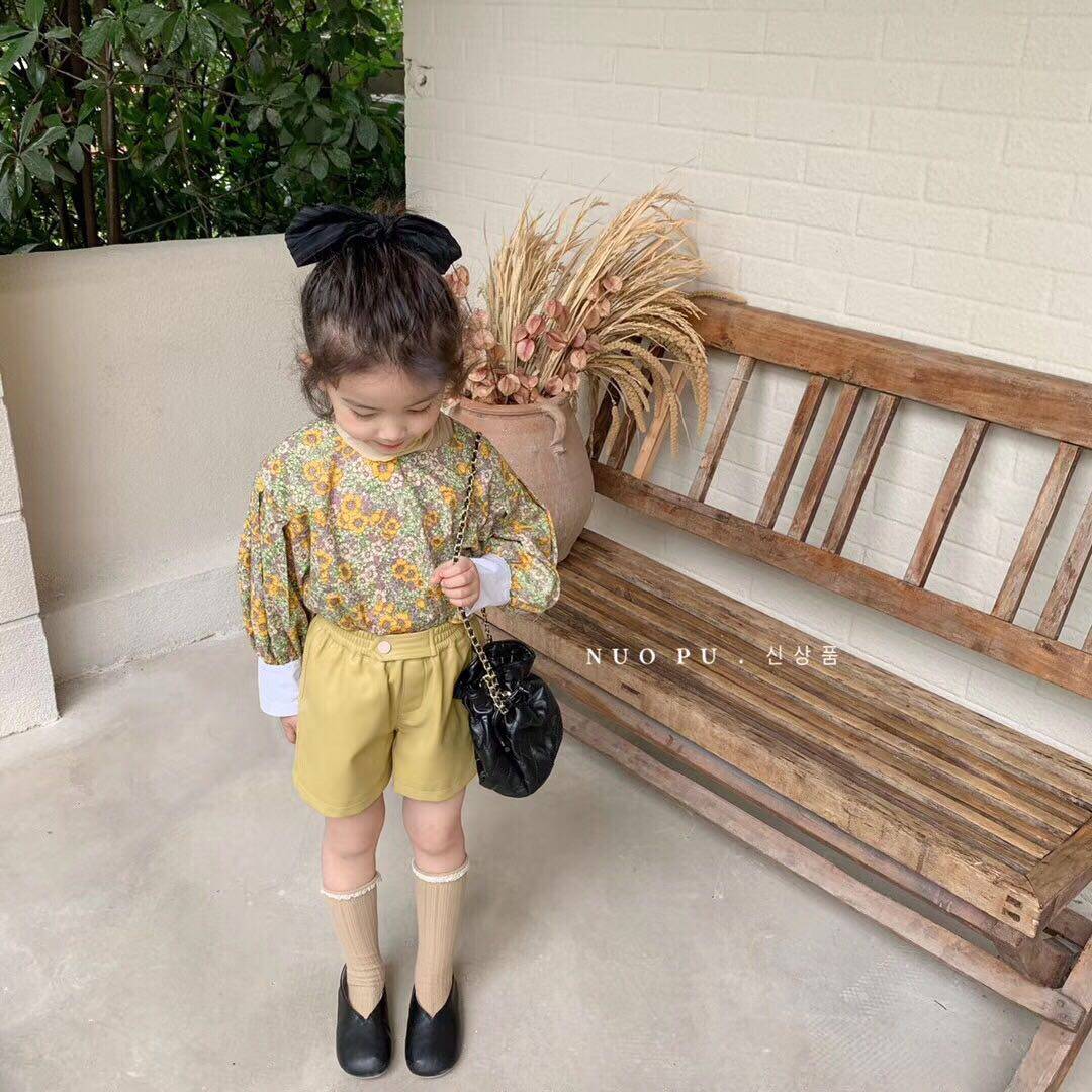 Xuan baby Korean Children's clothing Children's retro floral long-sleeved shirt Foreign school top Girls Korean high-waisted leather shorts