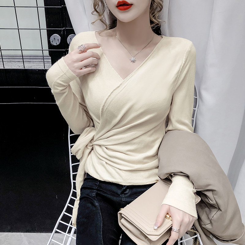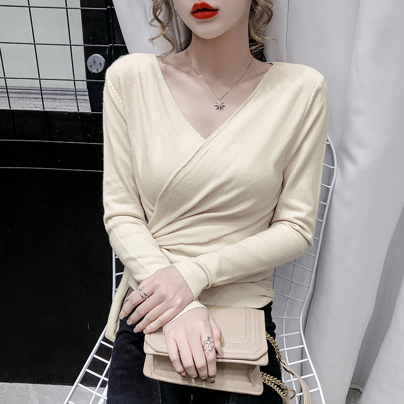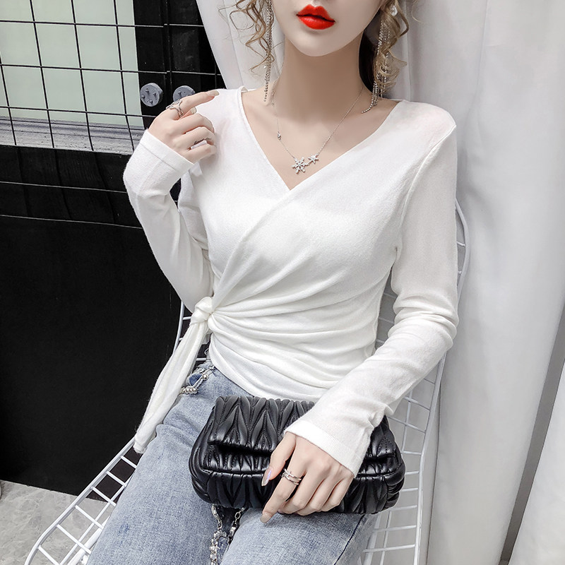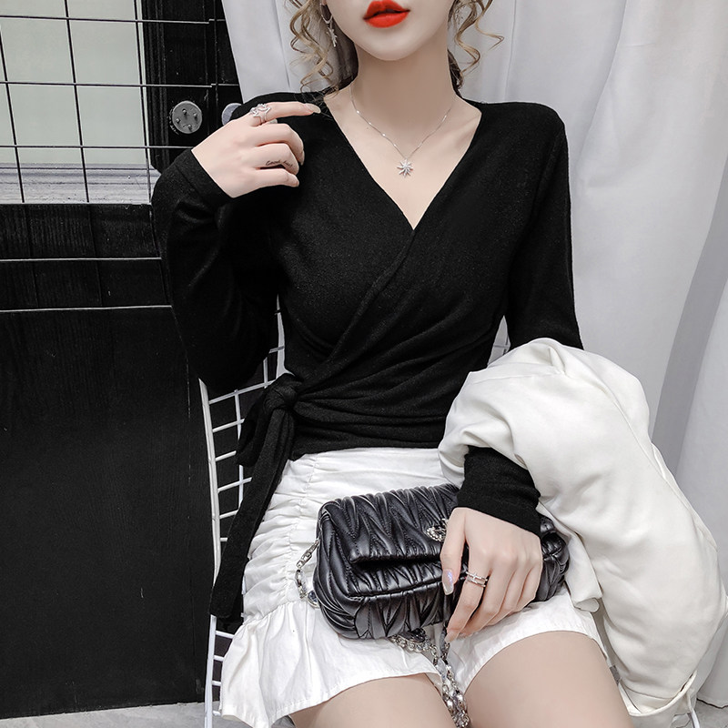 ocnltiy 2023 new knitted sweatshirt woman slim fit sexy V collar cross strap long sleeve blouse-Taobao