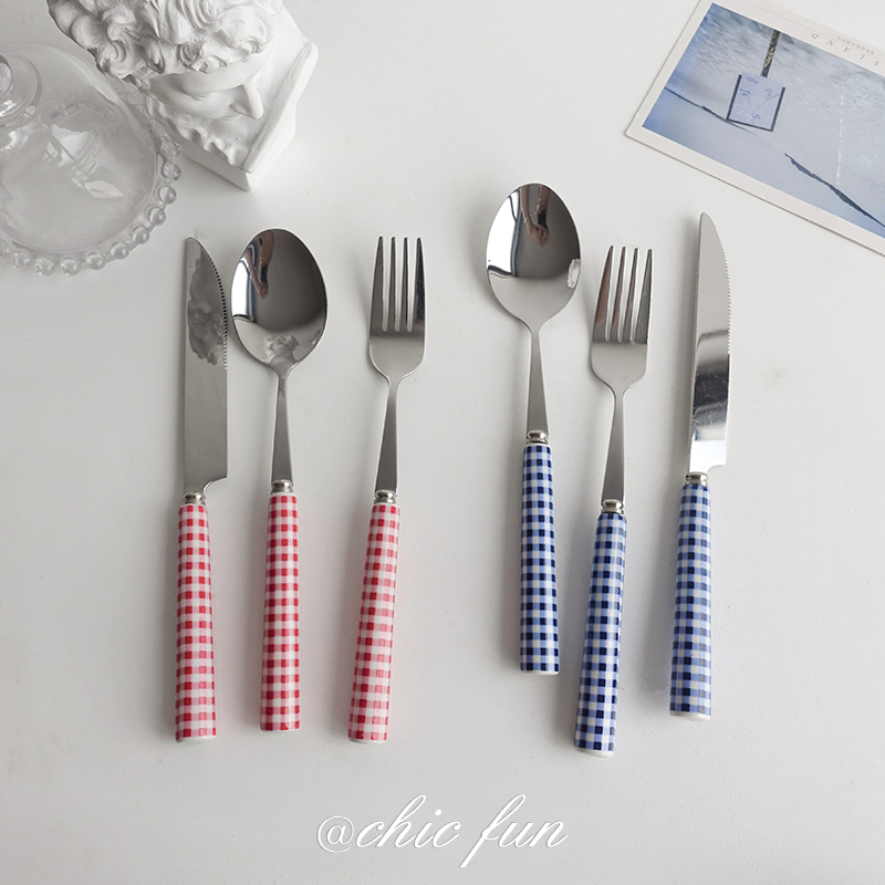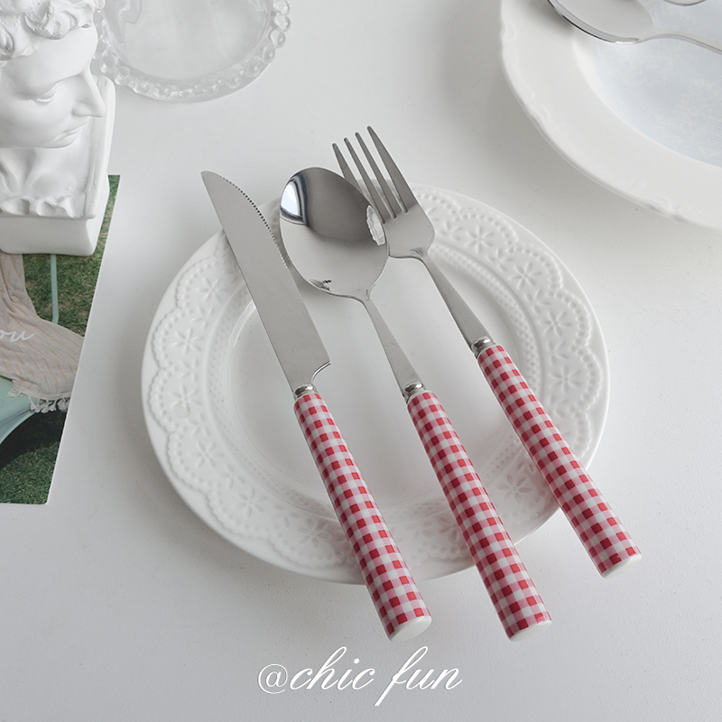 chicfun Korean ins wind Western style knife, fork and spoon tableware set Red basket plaid creative cute retro household