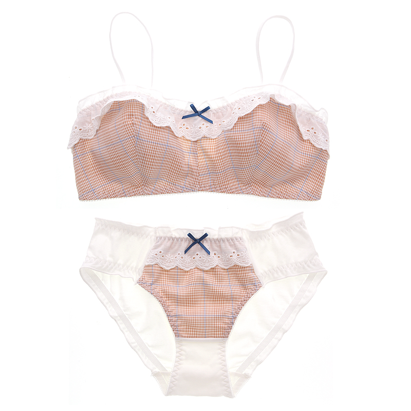 Retro Sweet Underwear Suit Pure Cotton Plaid Girl Fresh Lace Lingerie Comfort small breasted cotton Cuddly cute