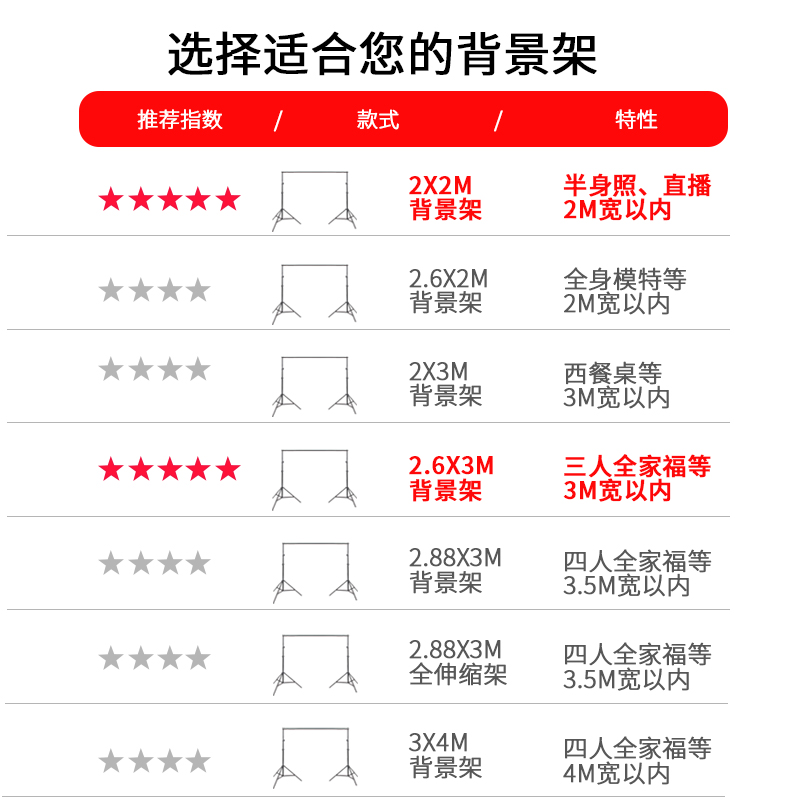 1*2T Type of background frame 1 5 * 2T Type of background frame 2 * 2T Type of background frame 2 * 2 m Background frame (delivered with 4 clips) 2 6 * 2 m Background frame (delivery package 4)