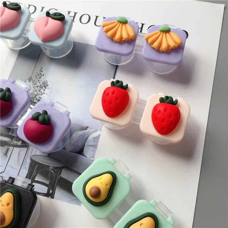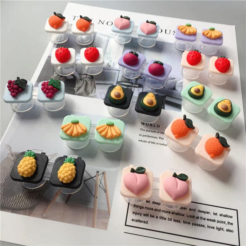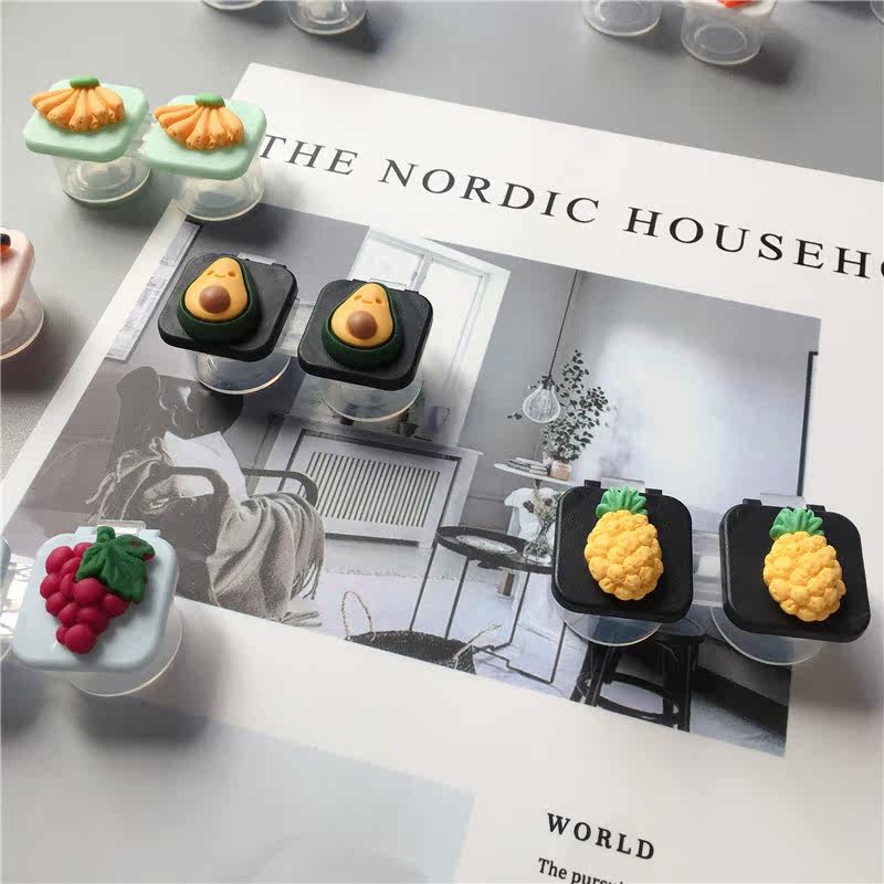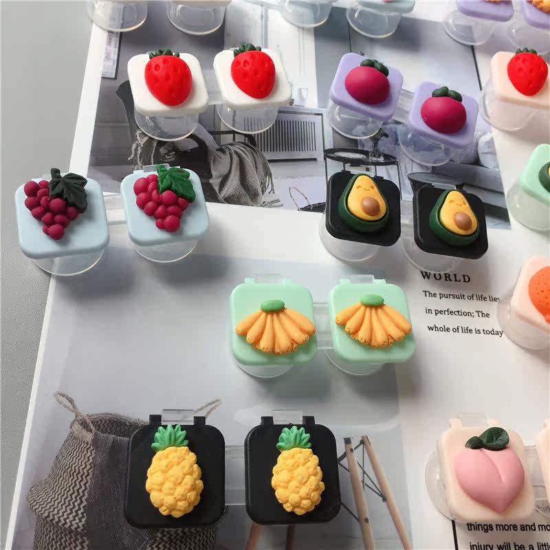 Two strawberries White pressing box two strawberries Pink pressing box two oranges White pressing box two oranges Pink pressing box two pineapples Black pressing box two bananas Green