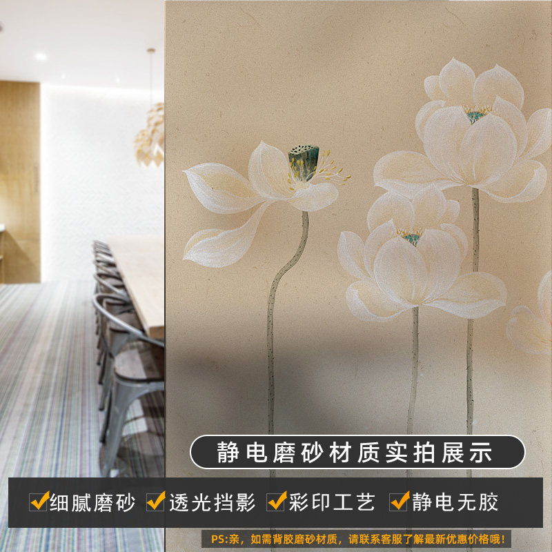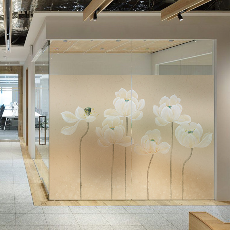 New Chinese hand painted lotus office partition decoration glass adhesive film light transmission opaque electrostatic frosted sticker