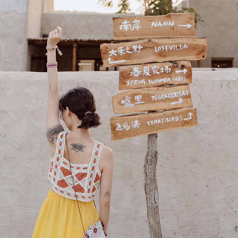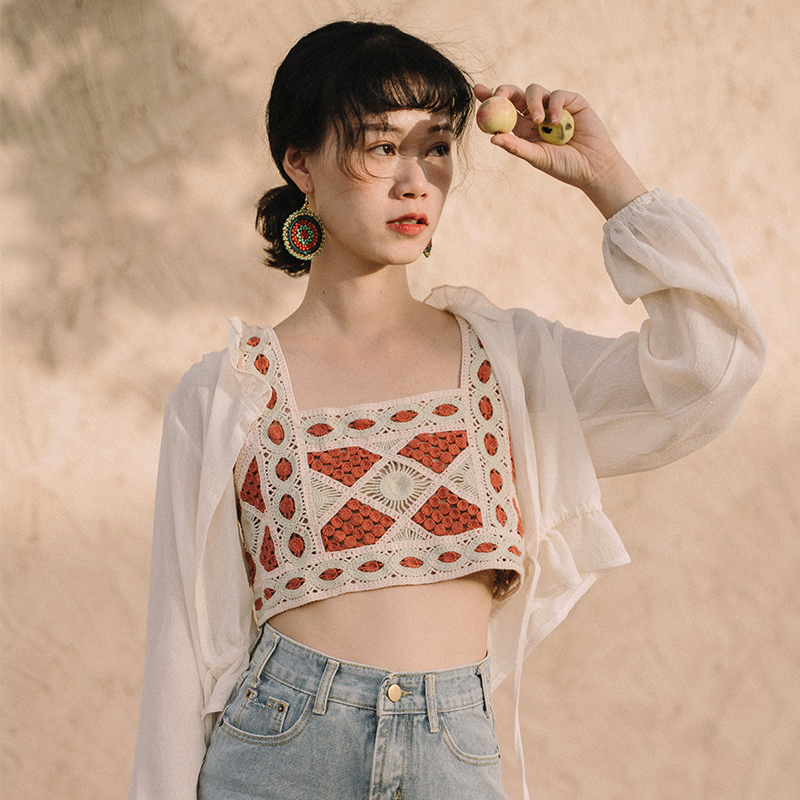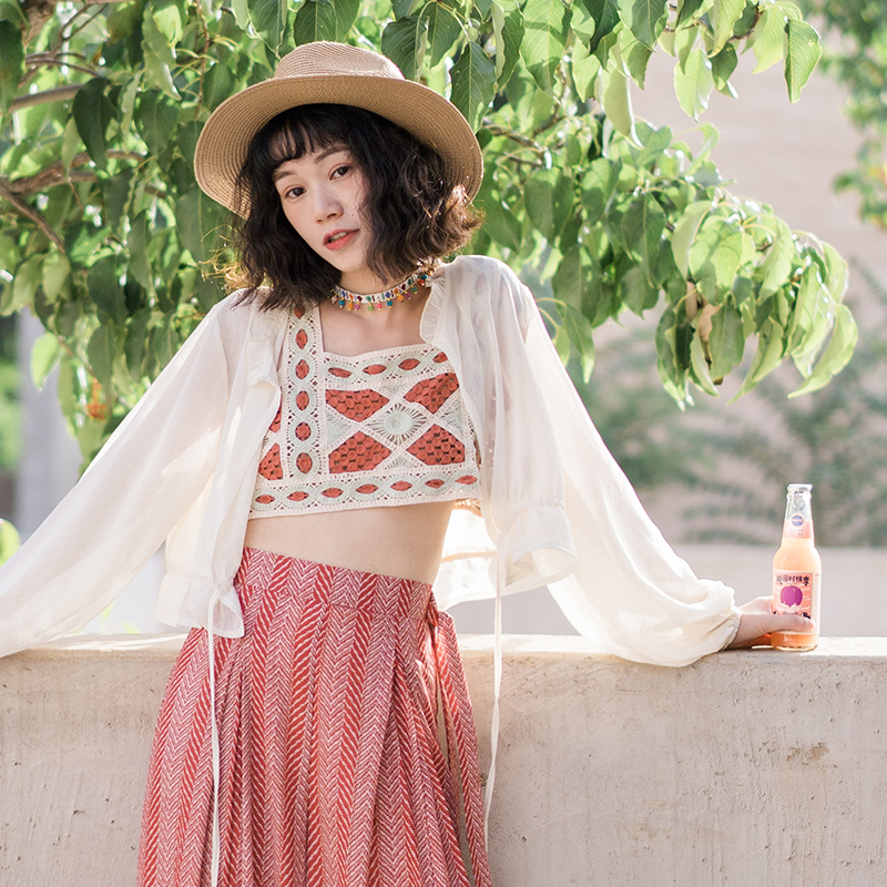Bohemian knit harness Thai resort wind blouse with belly button outside wearing short and small sub-vest