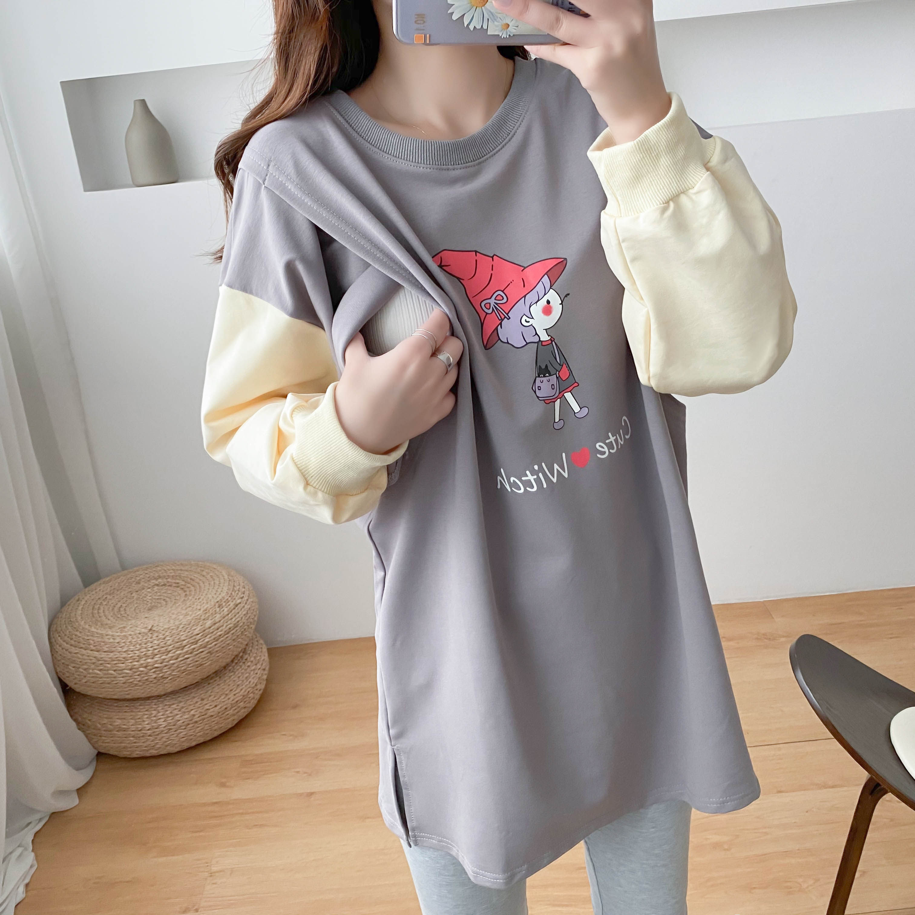 2021 spring Korean version loose large size cartoon maternity sweater mid-length cotton long-sleeved spring breastfeeding top