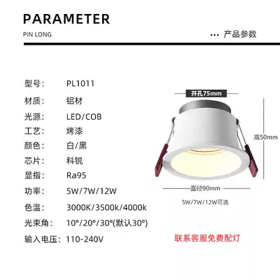 Pinglong LED spotlight without main lamp living room wall washer 5w7w12W narrow edge deep cup anti-glare 30deg beam drilling 75