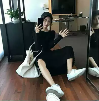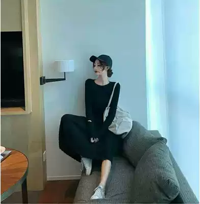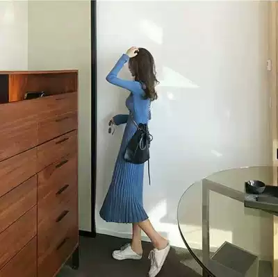 French retro waist long sleeve sweater bottom skirt temperament goddess Fan nei knee knitted dress autumn and winter