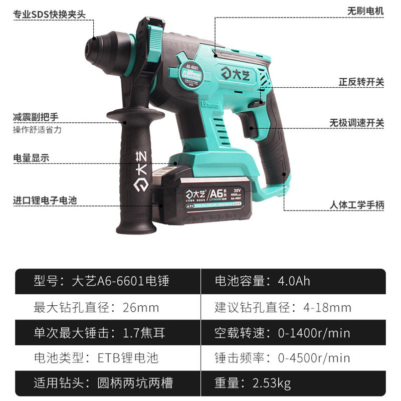Black, dark gray, cyan, light green, 6601 single-use electric hammer-40S, one battery, one charge, 6601 single-use hammer, 40S, two batteries, one charge, 6601 single-use hammer, 60D, one battery.