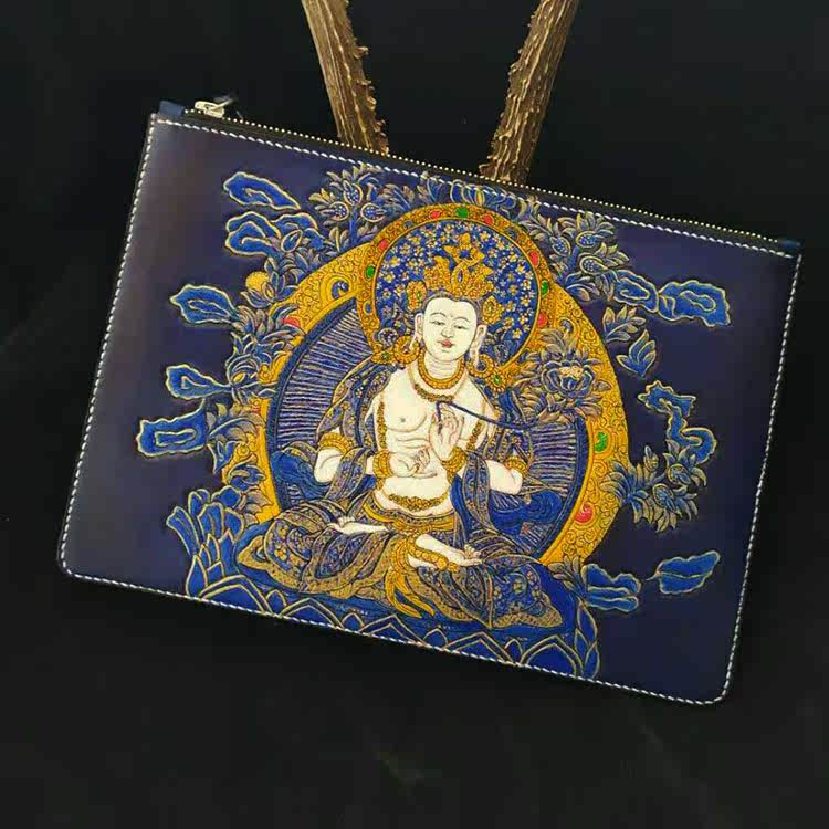 Handmade leather engraved envelope bag youth clutch bag men's vintage zipper casual women's cowhide thangka pattern briefcase
