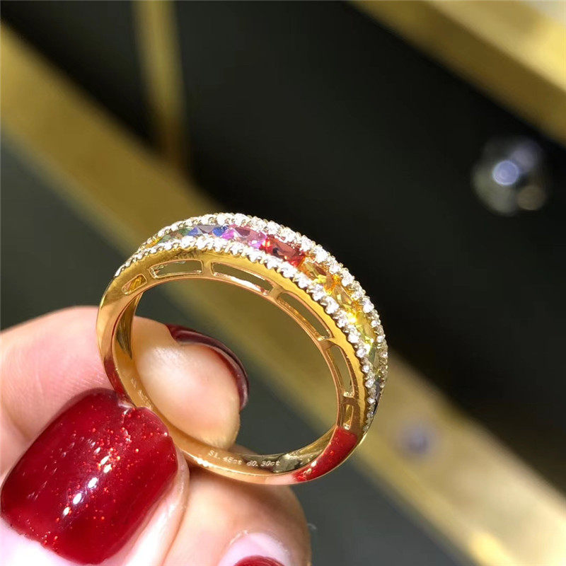 Rainbow colorful 1 45 carat colored gemstones 30 minutes diamond 18K gold thick inlaid ring obvious skin