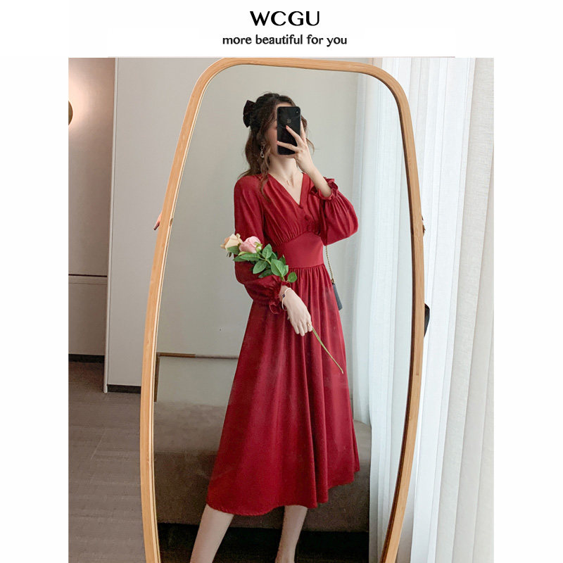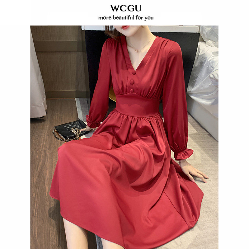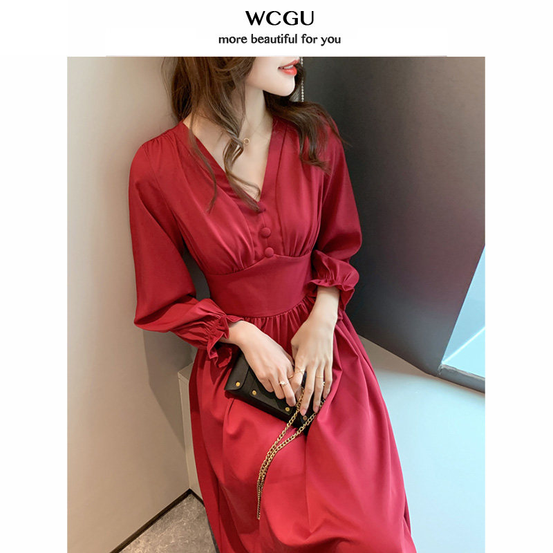 wcgu French waist thin temperament long version dress red long sleeve V neck retro Hepburn style long skirt autumn