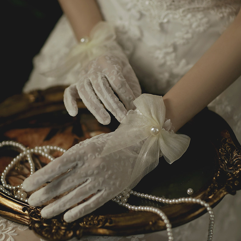 2021 New Bridal Wedding Short Lace Silk Yarn Mesh Bow Gloves Spring and Summer Wedding Photo Accessories