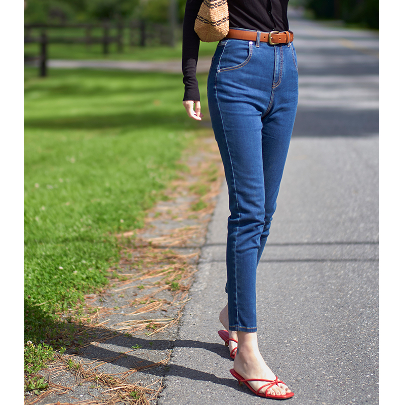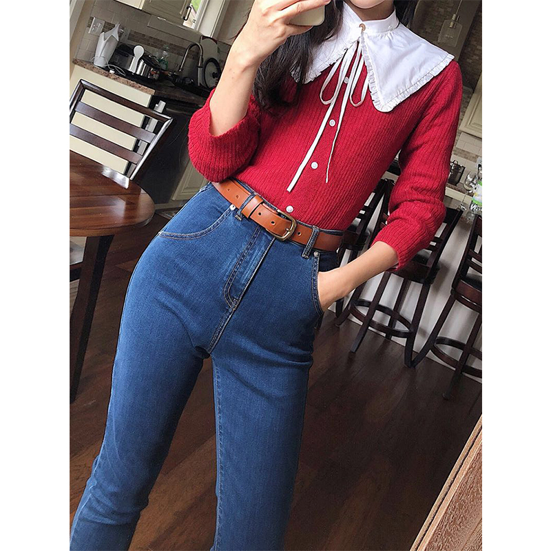 Cloche early autumn new repair high waist imported cotton retro jeans women's straight slim high elastic trousers look thin