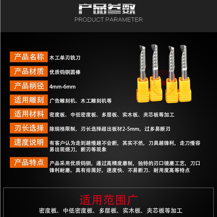4mm6mm single-edged spiral milling cutter MDF solid wood cutting hollow CNC computer engraving machine tungsten steel cutter