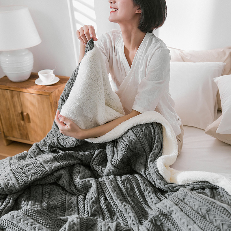 Nordic knitted blanket plus velvet thickened coral fleece double-layer office nap blanket wool woven tassel blanket