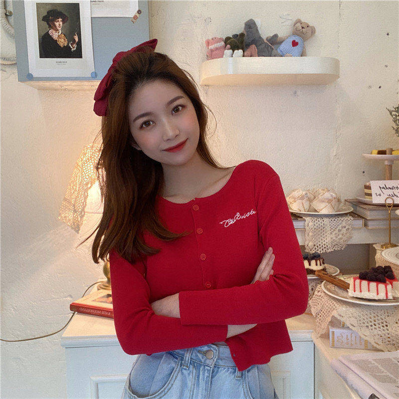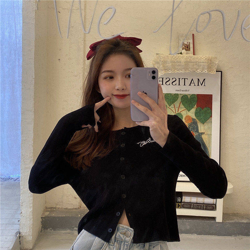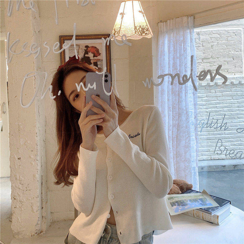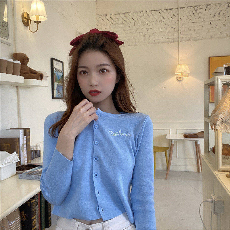 Solid color spring and autumn 2023 new long-sleeved short section Korean knitted cardigan top female embroidery letter button design