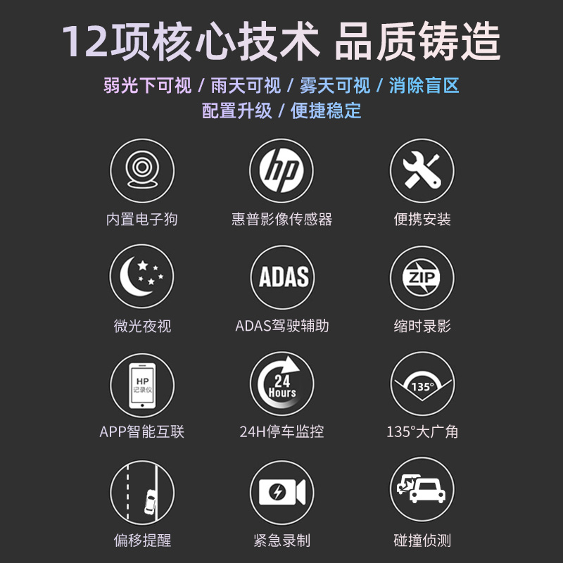 Positioning Reversing image Motion detection Loop recording Fixed speed measurement Parking monitoring Night vision fill light Lane change assist Fatigue driving reminder Track deviation warning Forward collision warning