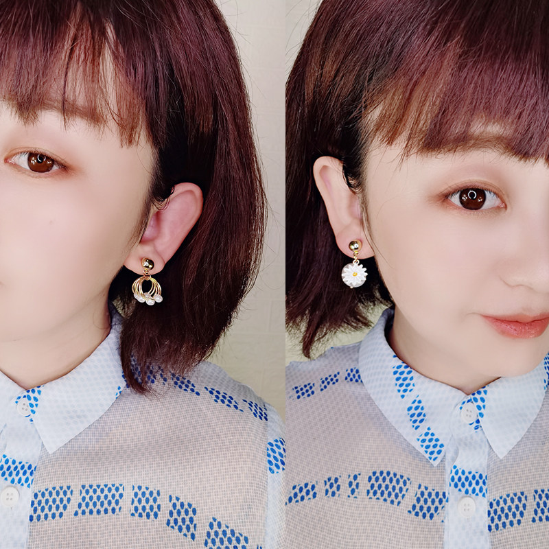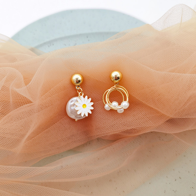 New Tide Products South Korea Asymmetrical Chrysanthemum Pearl Ear Nail Woman 925 pure silver anti-allergy transparent U-ear clip without pain