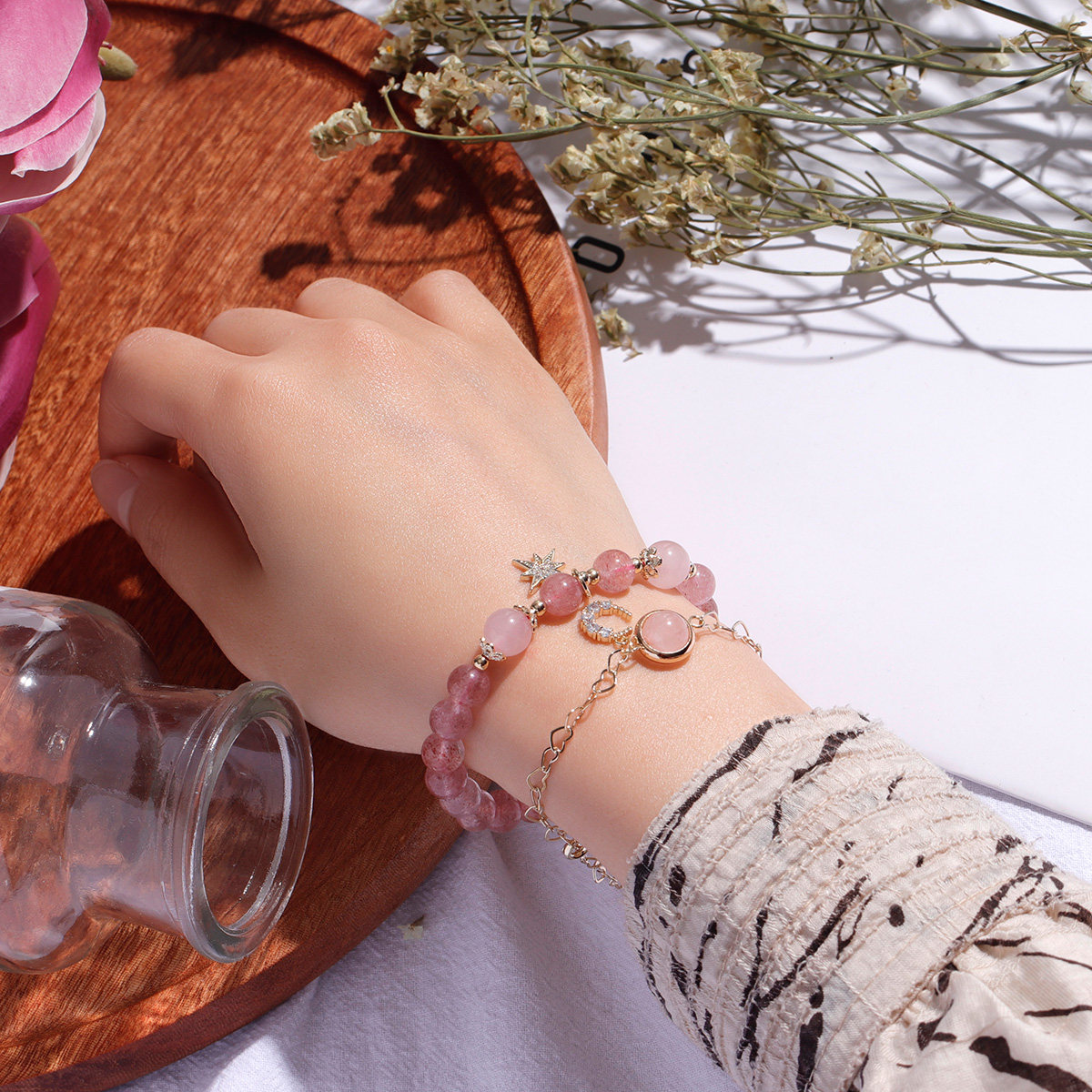 Lifetime One Stone Natural Strawberry Crystal Powder Crystal Double Chain Hand Strings Female Hand Alchemy Small Crowddesign Senior Feel Gift