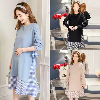 Maternity clothes autumn 2021 new out of fashion loose large size stitching plaid one-piece skirt pregnant women over-the-knee long skirt