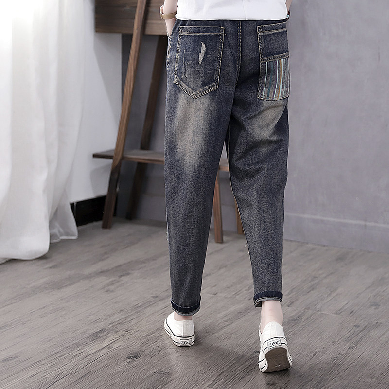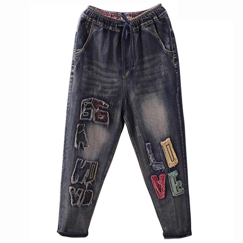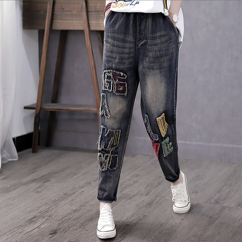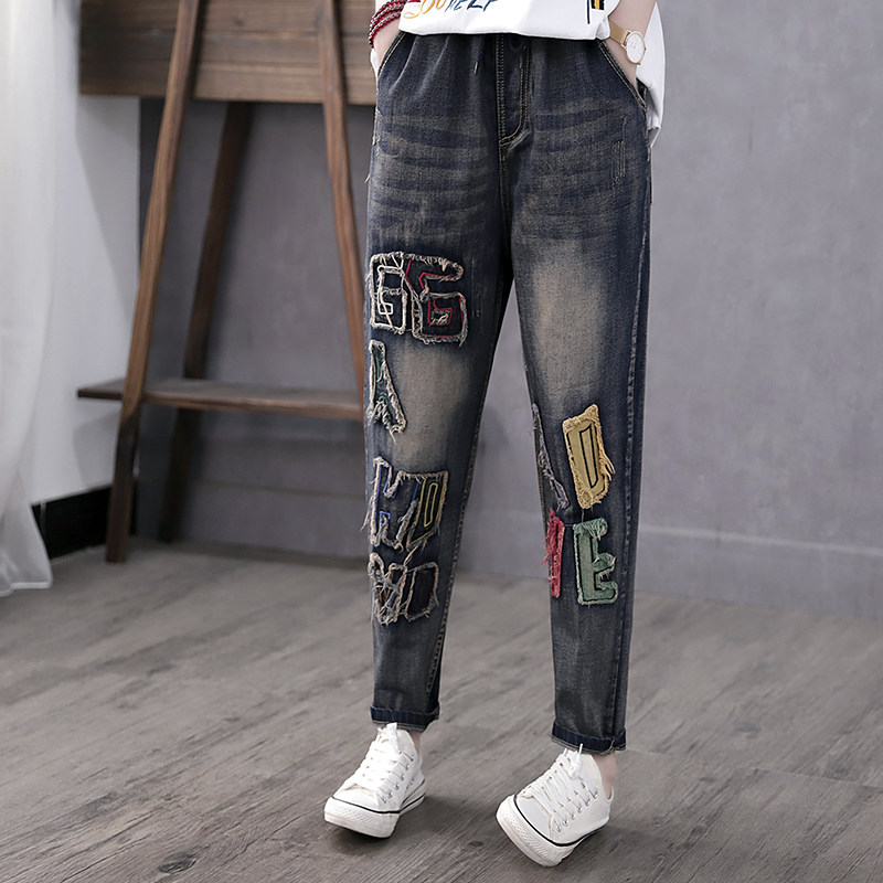 Han Soi retro literature and art autumn high-waisted jeans women's thin letters embroidered patch nine-point pants Harem pants