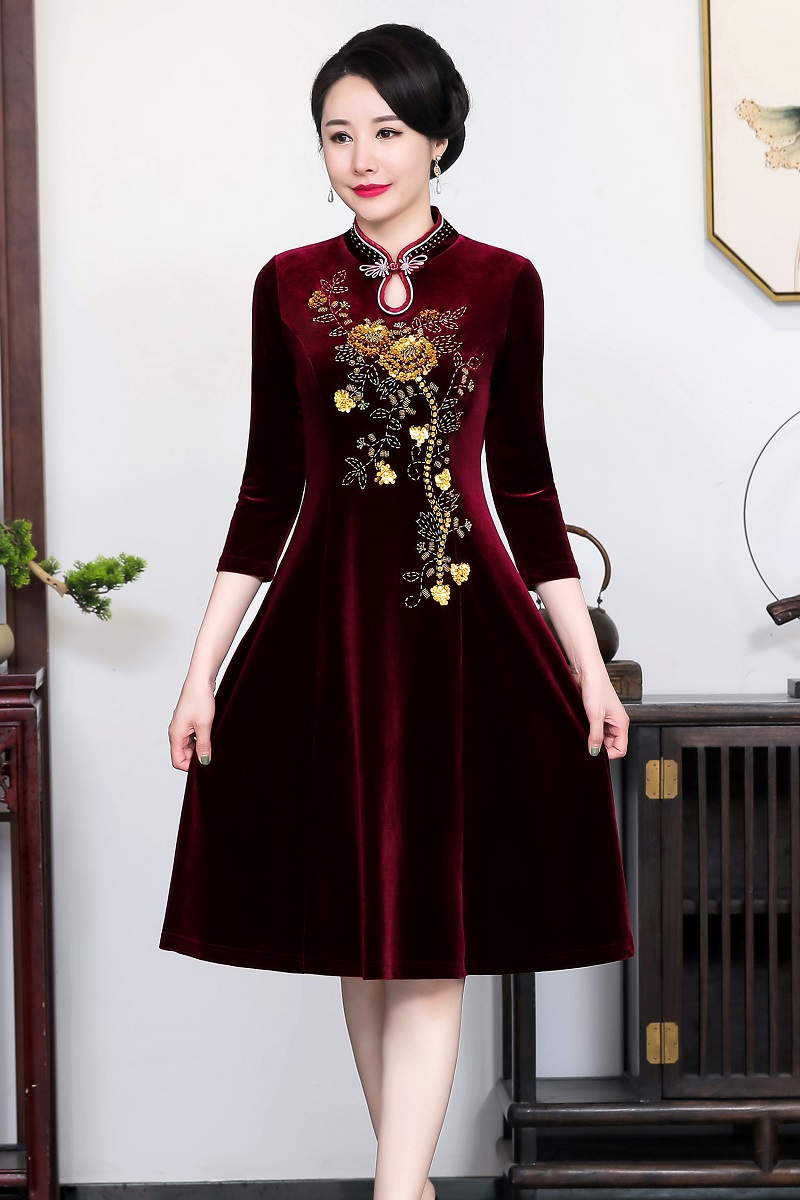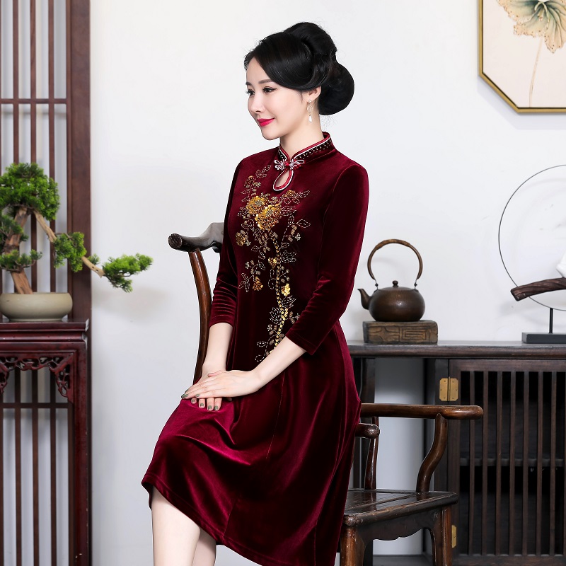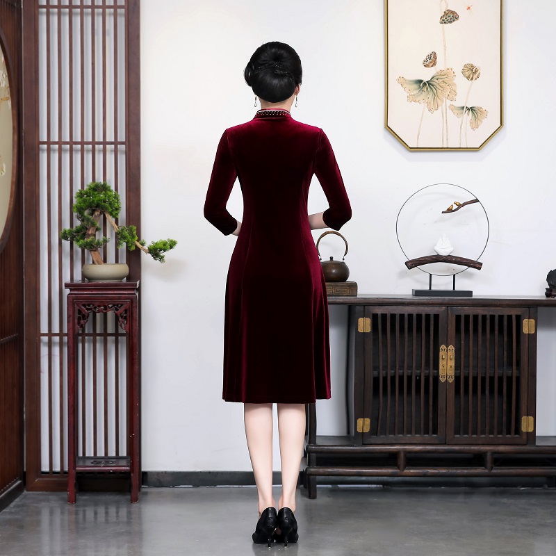 Golden velvet qipao with long version of autumn and winter plus suede thickened and noble middle-aged and elderly moms happy mother-in-law wedding party dress