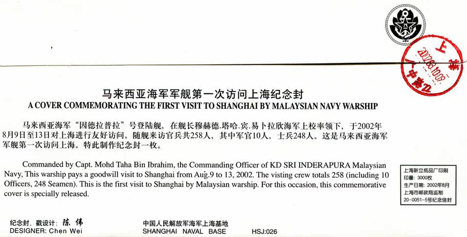 HSJ:026 Commemorative Cover of Malaysian Navy Warship's First Visit to Shanghai