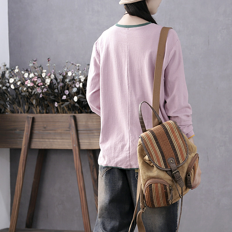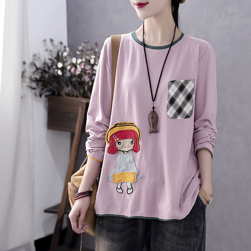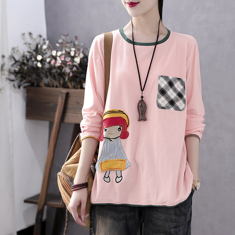 Han Soyi retro art early autumn new cloth appliquary embroidered long sleeve T-shirt female loose with lazy wind round collar blouses