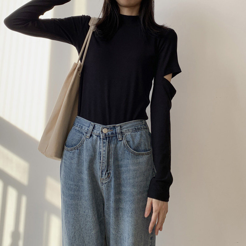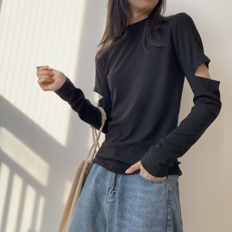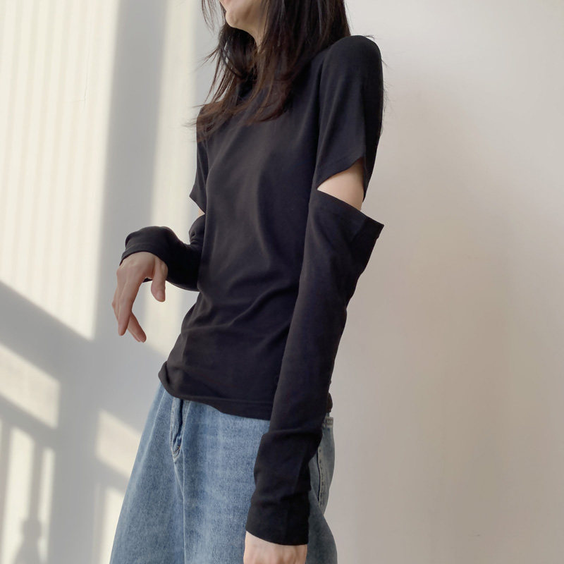 Black bottom shirt women elbow holes tight show thin half turtleneck top cotton long sleeves T-shirt students fashion