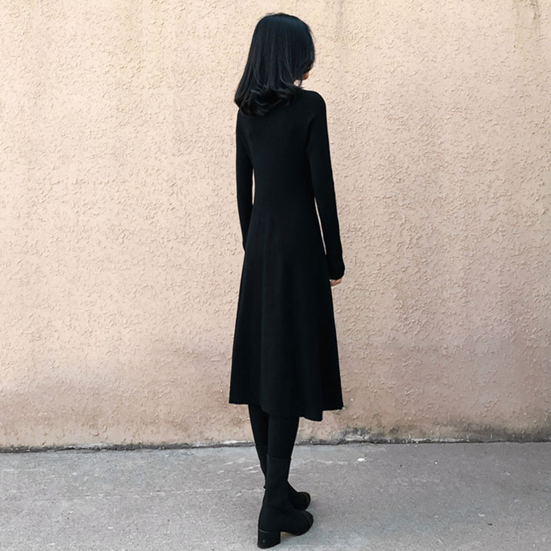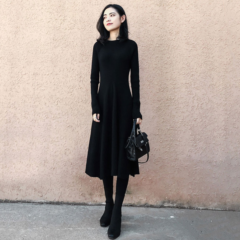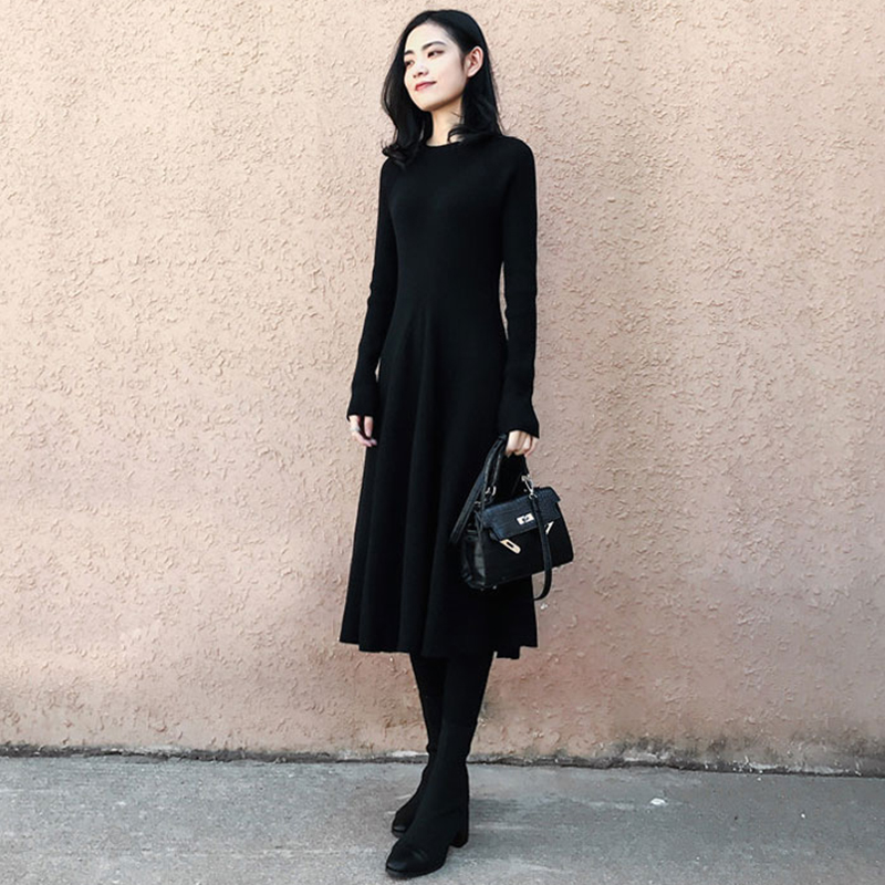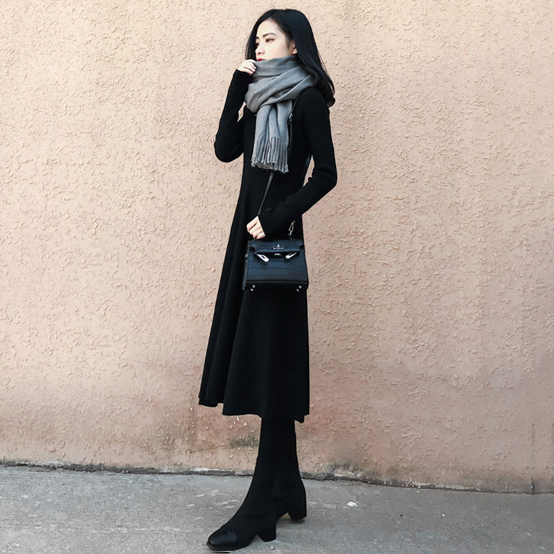 Face-style Retro Knit inside lap dress Women's autumn winter Nets long version over kneecap length dress Herben Little Black Black Dress