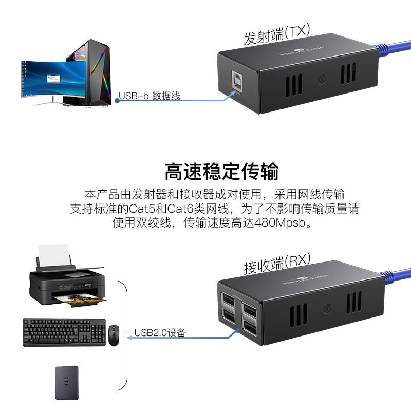 PWAY HT233U USB extender 50 meters long network transmission USB signal transceiver amplifier USB to RJ45 network transmission extender active remote camera monitoring