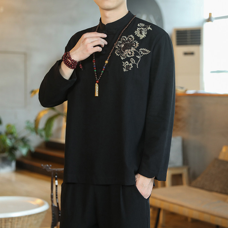 Autumn Chinese style men's rose embroidery long-sleeved T-shirt ethnic style bottoming shirt men's large size loose top clothes