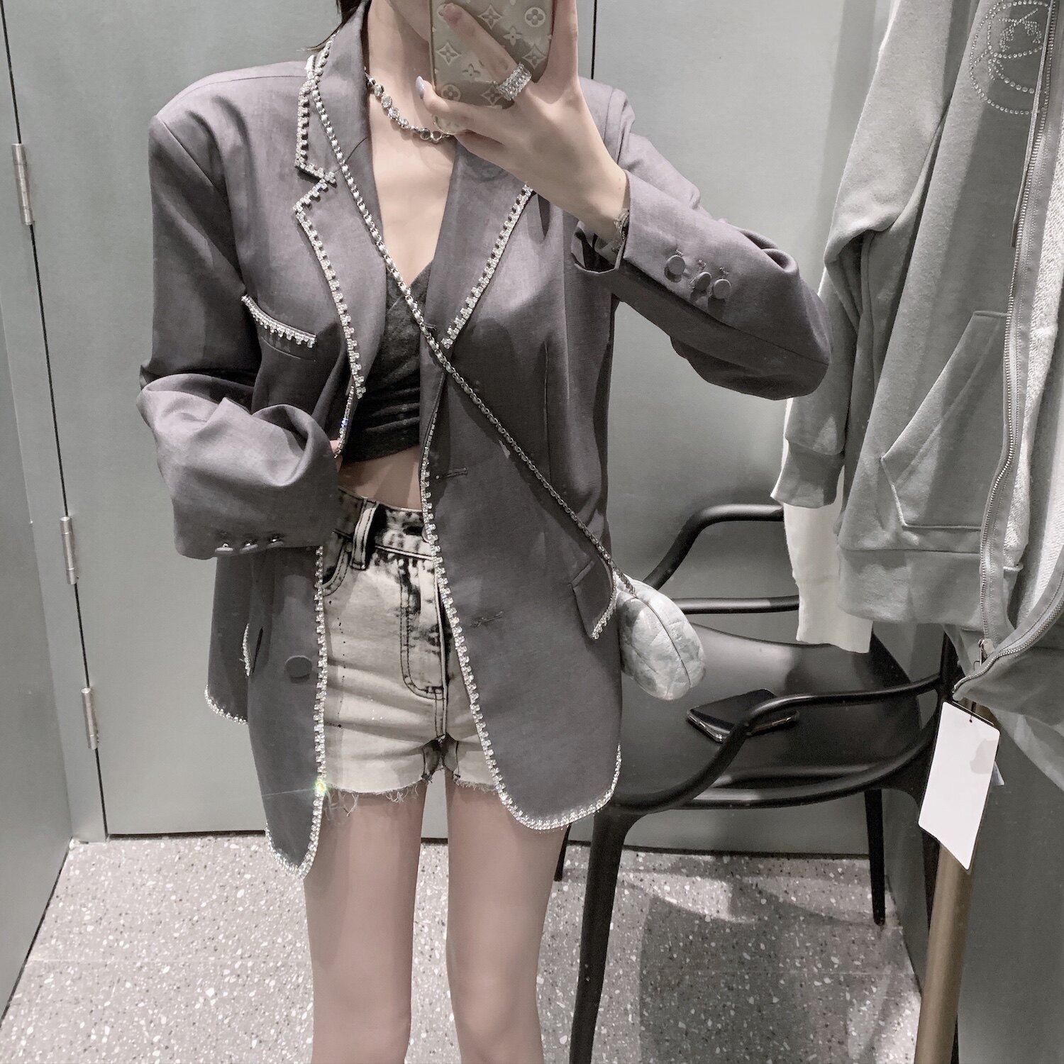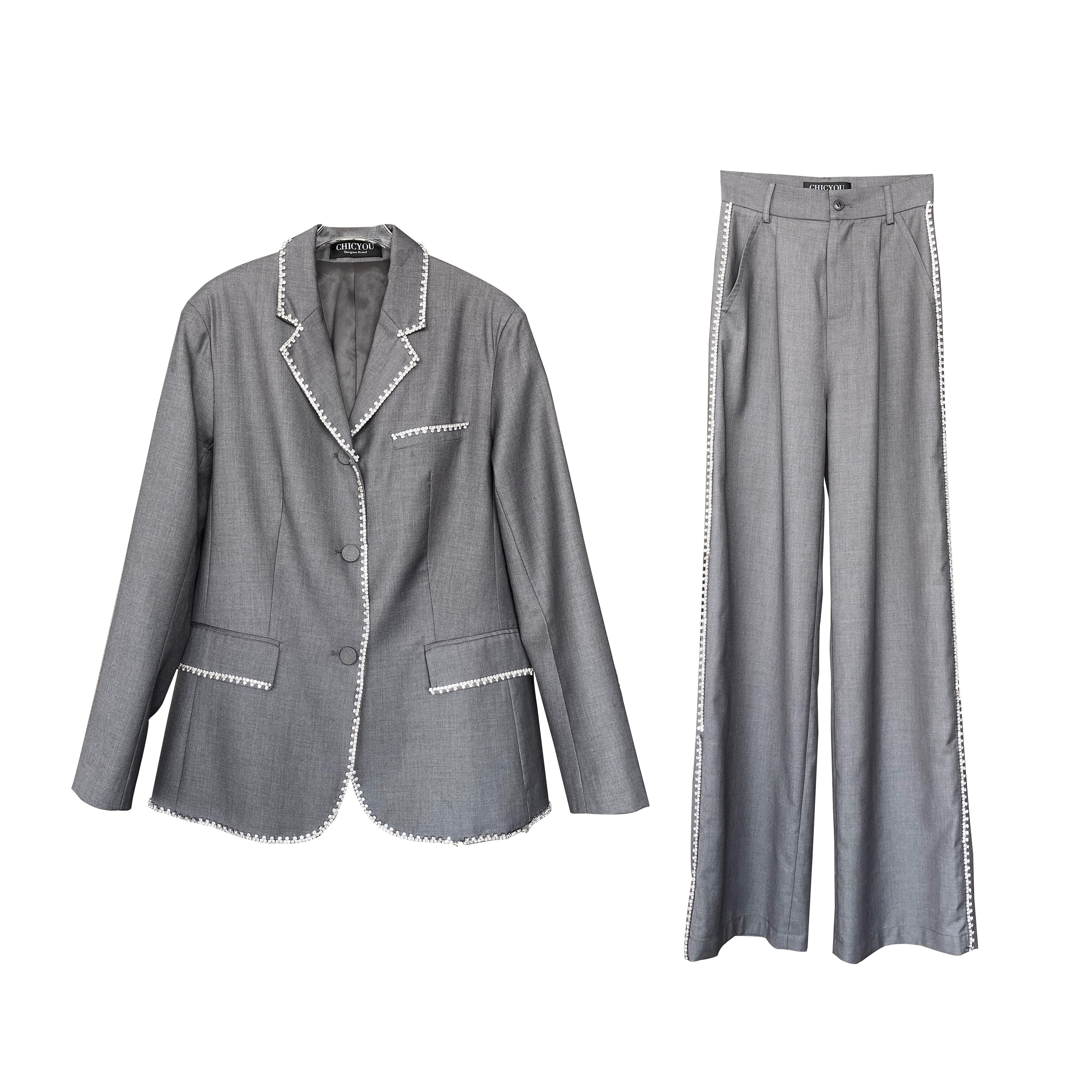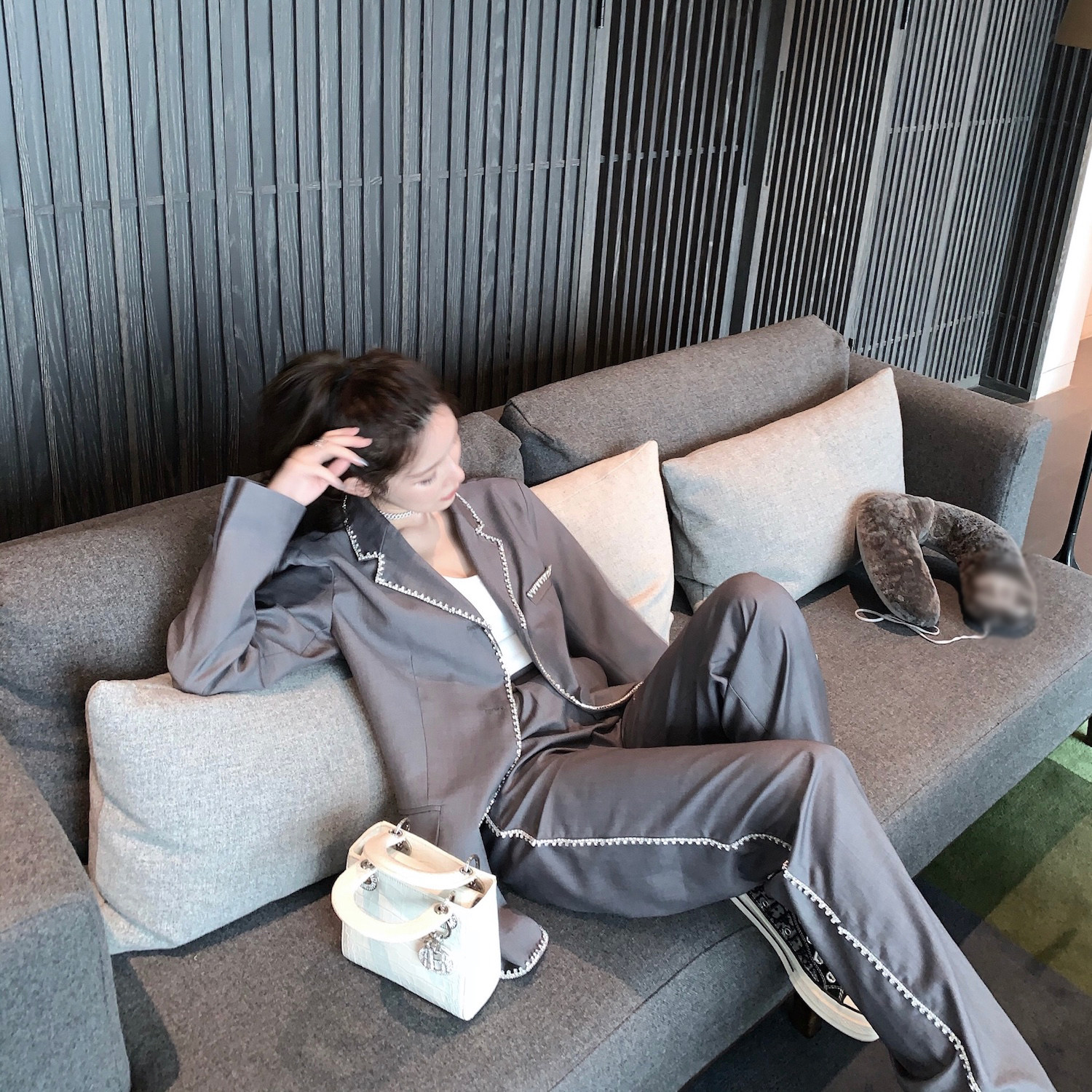 (5 Fold Clear Cabin) (Teenage Girl Love Bean) Casual Trendy Ins Grey Drilled Side Suit Short Skirt Long Pants Suit