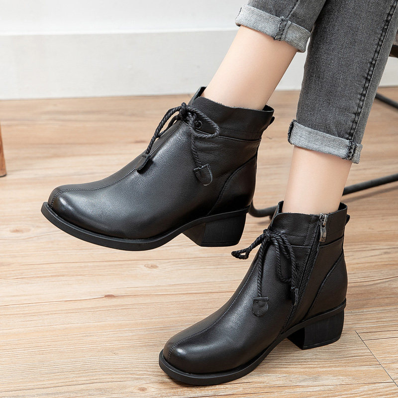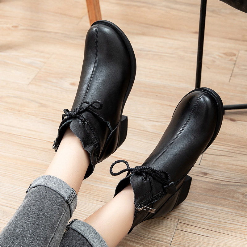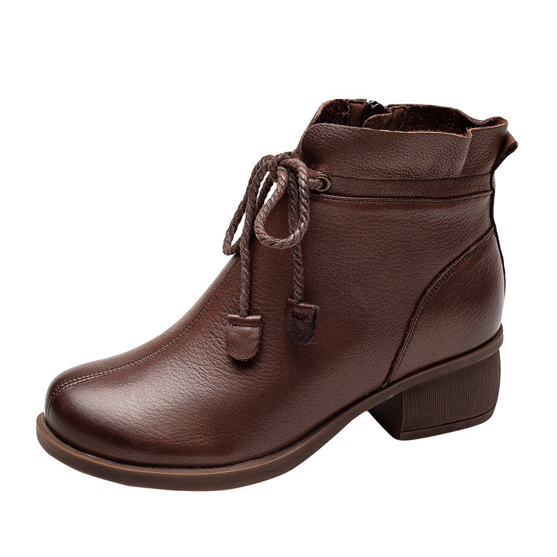National Wind Retro Style Heel Bull Leather Short Boots Female Cotton Shoes Glint Nude Boots Coarse Heel Mother Short Silo Boots Woman single boot