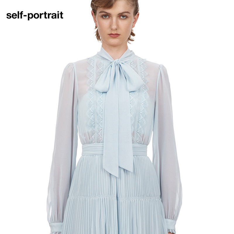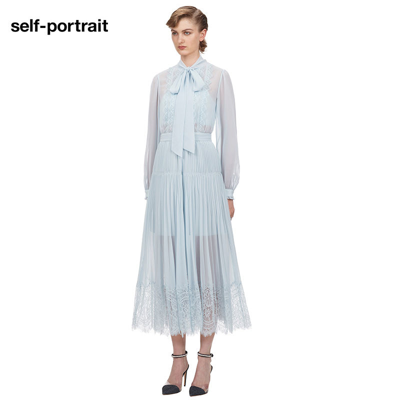 self-portrait Blue Chiffon bow tie dress thin long sleeve pleated midi dress