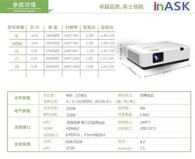 inASK Inserprojector i3 i3 i5 i7 i9 i9 Android System Home Business Office Phone Wireless