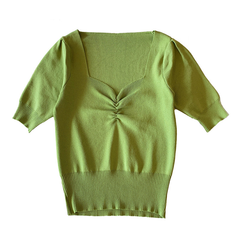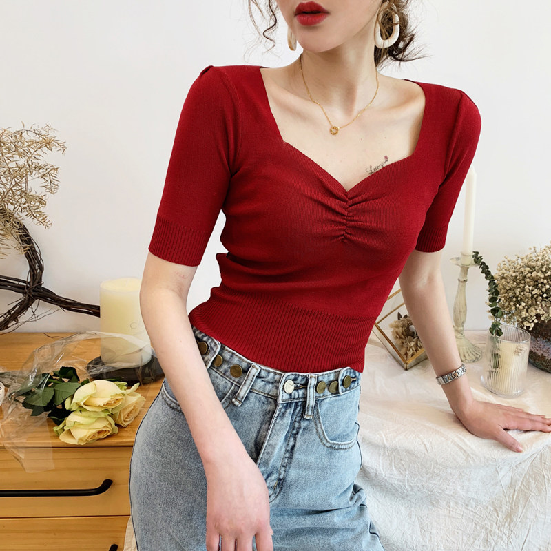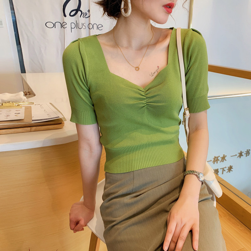 High waist short T-shirt female short sleeve 2022 New net red ins Chains Chaochio Tight Collarbone Knitted Square Collar Blouse