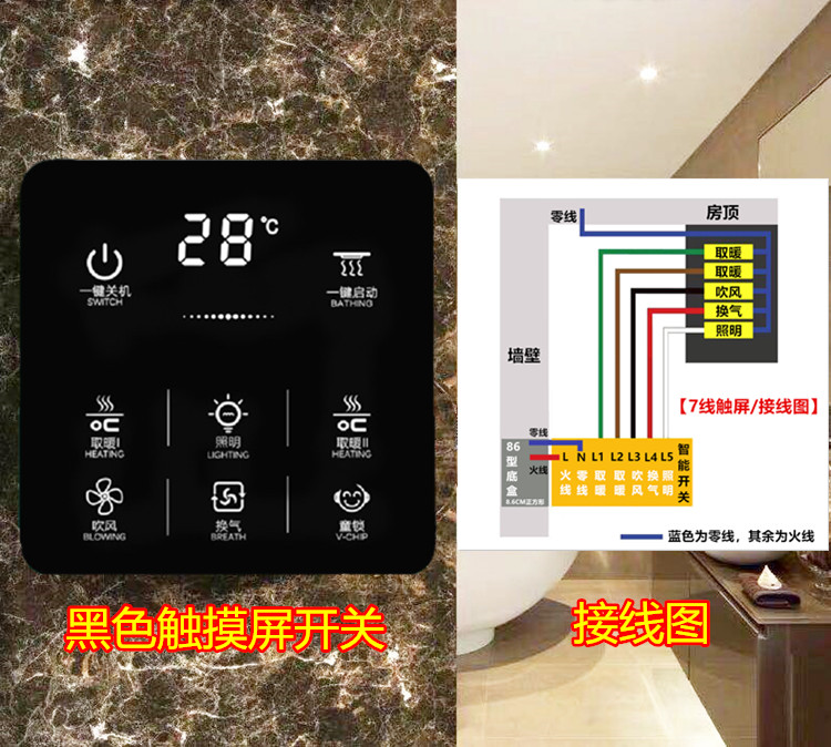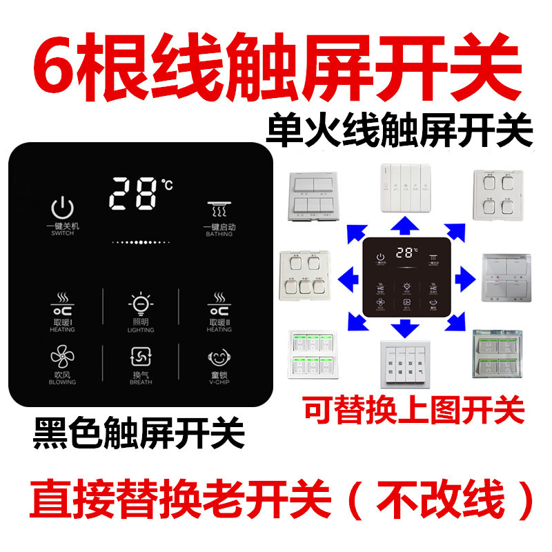 Smart touch screen switch bath master five-in-one 5 open touch screen switch panel toilet bath master switch wired anti