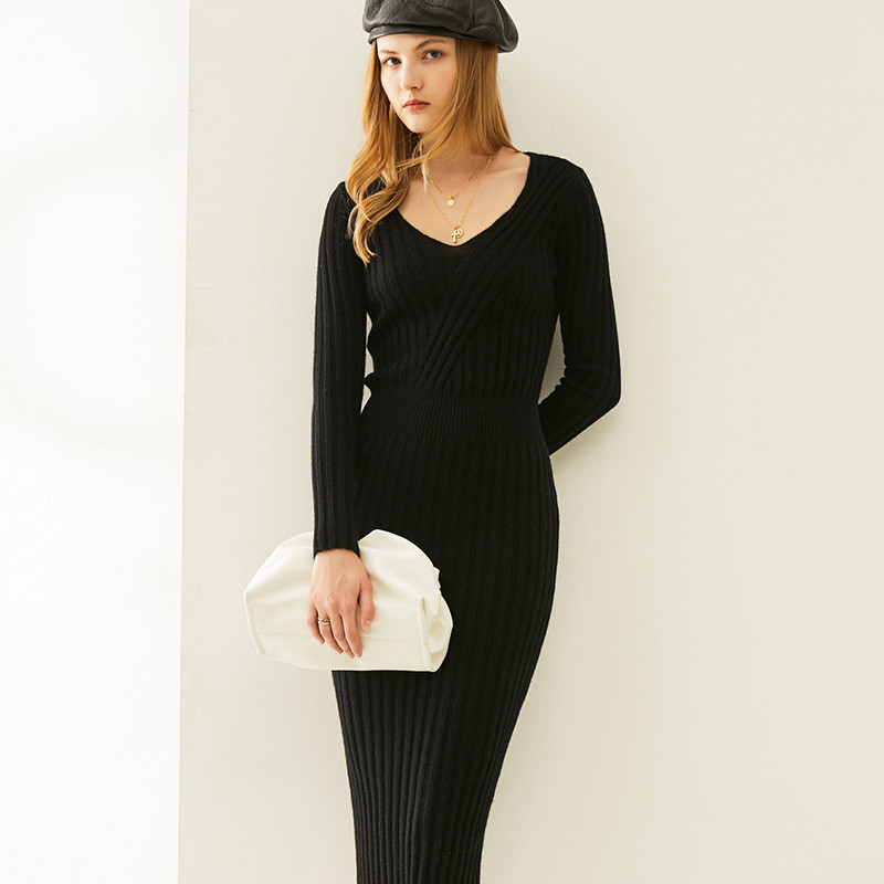 2020 slim V-neck solid color 100% wool knitted base sweater dress autumn and winter cardigan women's medium and long version of women